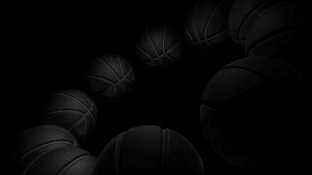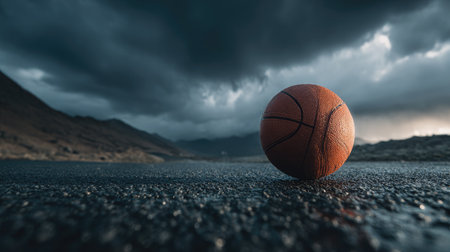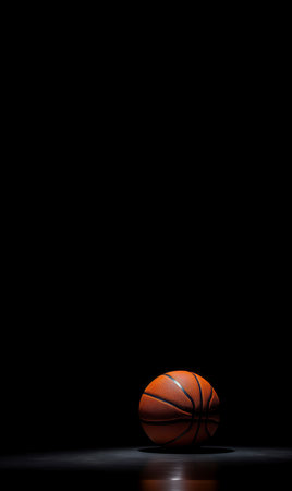 A basketball ball lit by sunlight on a dark concrete background. Selective focus.
