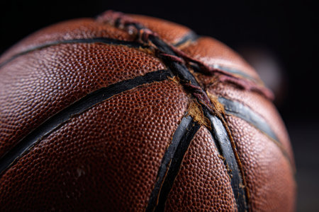 A close-up view of a basketball showcases its textured surface and black seams, providing a dynamic sports image. Banner with copy space for text