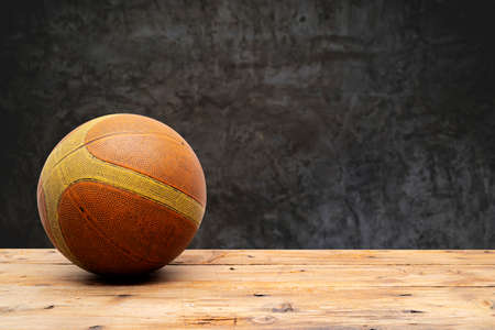 Basketball balls for sports and games are placed on a wooden table with a dark cement wall.