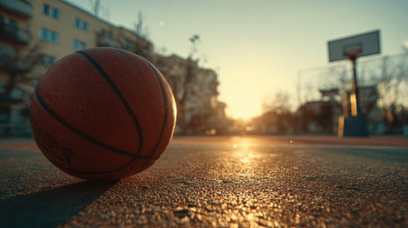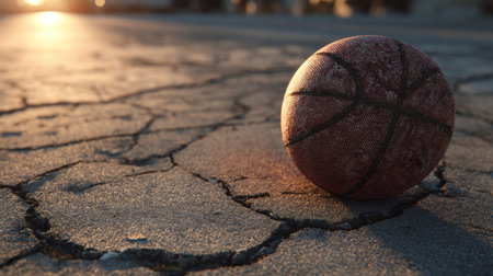 Bright orange basketball sits on the rough surface of an outdoor court, surrounded by faded lines and vibrant colors at dusk. Shadows stretch as the day comes to an end.