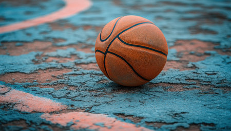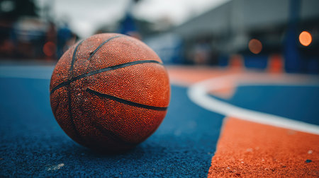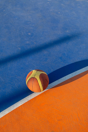 Basketball on outdoor court with blue and orange floor. Sport and healthy lifestyle concept. Abstract view of the court.