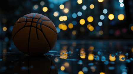 Water droplets bead on a basketball as it sits on a shiny wooden floor during heavy rainfall at dusk.