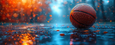 Basketball ball with natural lighting on blue background. Blue color filter. Sport team concept. Horizontal sport theme poster, greeting cards, headers, website and app