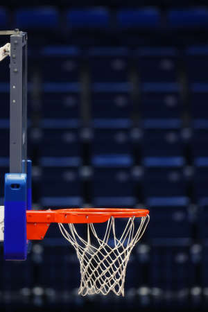 A captivating close-up of an empty basketball hoop inside a dimly lit sports arena. The shot emphasizes the architectural details and atmosphere, evoking anticipation.