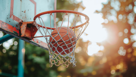 Warm sunlight illuminates a basketball perfectly falling through an old hoop and net on an outdoor court, creating a beautiful bokeh effect