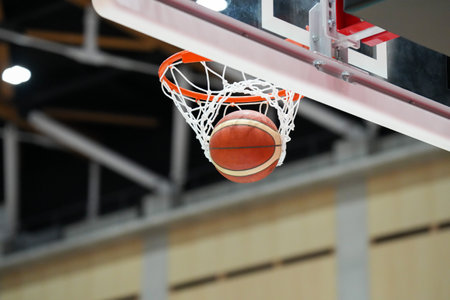 A basketball elegantly passes through the hoop's net, celebrating a successful shot during a game.