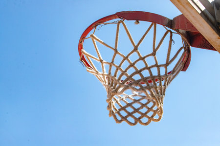 Street basketball hoop on a sunny day with blue sky in the background. Urban youth game. Concept of success, scoring points and winning