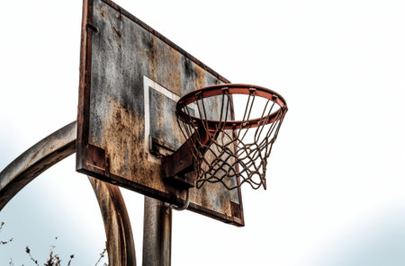 This image captures a vintage basketball hoop with an aged net, showcasing intricate details and rustic charm. Perfect for sports enthusiasts and creative projects.