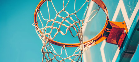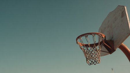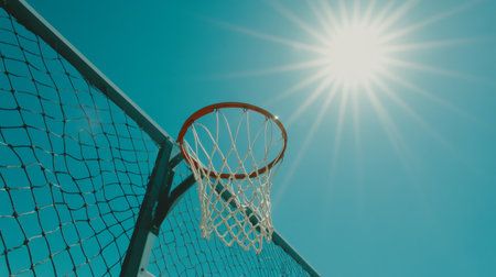 A stunning low angle view of a basketball hoop in a serene outdoor setting, capturing the essence of sport, skill, and the joy of play on a bright day.