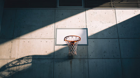 A striking basketball hoop set against a concrete wall, illuminated by gentle sunlight and shadows, ideal for representing sports, fitness, and urban lifestyle themes.