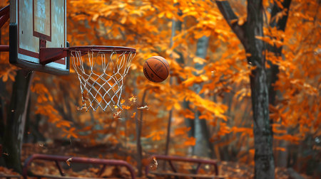 A basketball in mid-air approaches a hoop in a vibrant outdoor setting, capturing the essence of summer sports and athletic enjoyment.