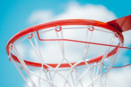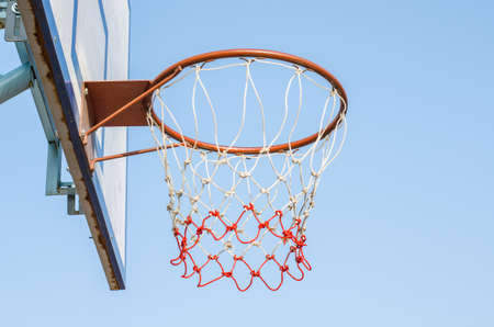 Basketball hoop, red ring and net, blue sky background, underview. Sunny day, outdoors sport court