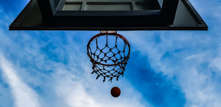 ball entering in a basketball hoop with the sky in the background, concept of urban sport outdoors, copy space for text