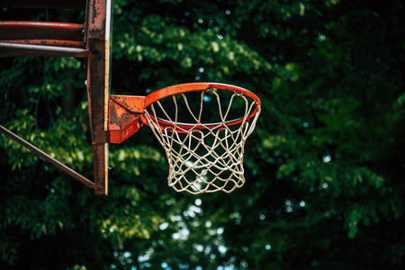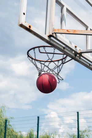 Basketball ball in basketball hoop with netting on court outdoors in summer on nature. Goal and aiming concept