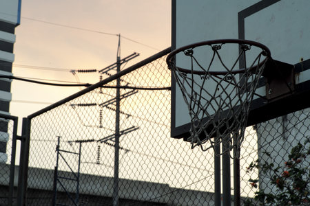 High angle view of old basketball hoop with the twilight sky background