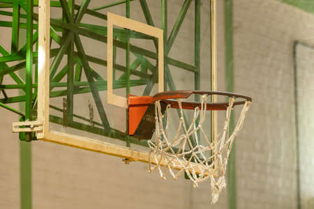 Low-angle shot of a basketball basket in a gymnasium. Blurred background. Sport concept. High quality photo