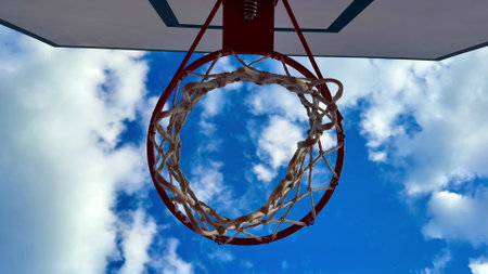 A stunning view captures a vibrant basketball hoop against a clear blue sky with fluffy white clouds