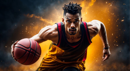 Male basketball player with ball on dark background