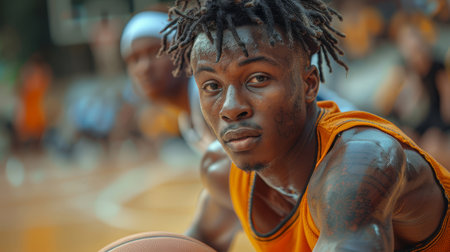 This striking image captures a focused male basketball player in the foreground with another player blurred in the background. Both wear orange uniforms, embodying sportsmanship and teamwork.