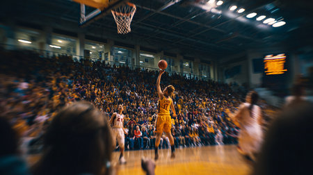 Action shot of a basketball player dunking, crowd cheering in the background, with intense focus on athleticism