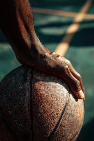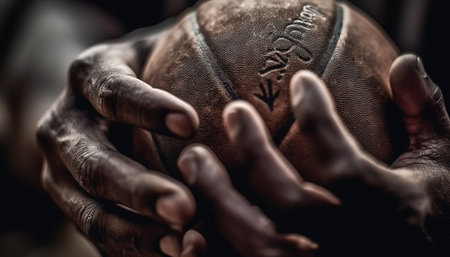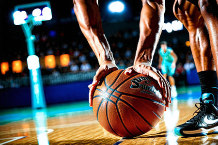 A dynamic close-up captures hands gripping a basketball, emphasizing its texture and dramatic lighting, perfect for sports-themed projects or promotional materials.