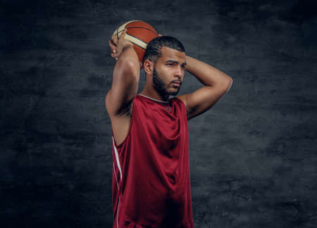 Professional basketball player holding a ball against black background. Serious concentrated african american man in sports uniform.