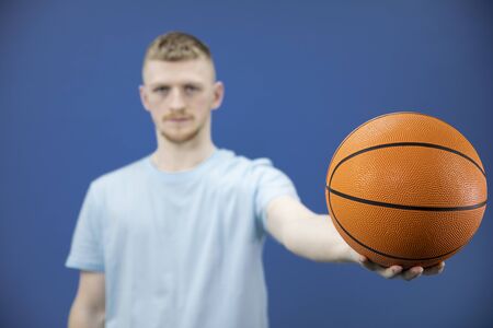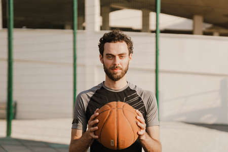 Bearded american student basketball player holds basketball on outstretched arm
