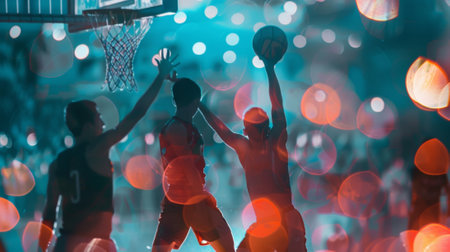 A dynamic basketball court with players in mid-action, showcasing their athleticism and teamwork