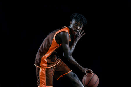 Professional african basketball player practicing with ball isolated over dark studio background.