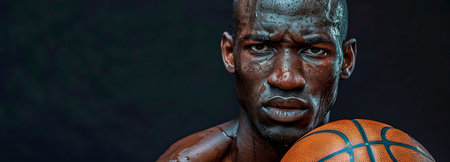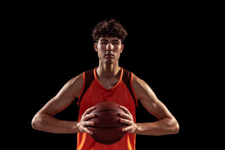 Close-up portrait of basketball player posing with ball isolated on dark studio background. Sport, energy, power, results.