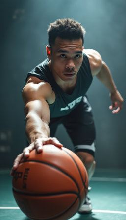 A focused male basketball player, with a determined expression, extends his arm to grasp a basketball on a dimly lit court. The dramatic lighting highlights his muscular physique and the intensity of the moment, capturing the essence of athleticism and dedication in sports.