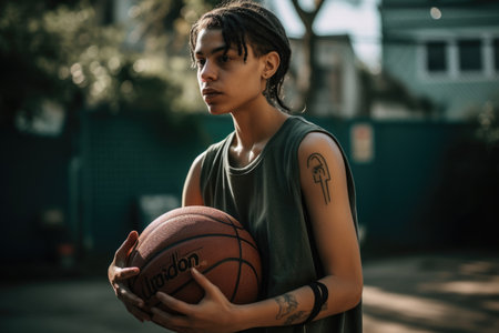 Non-binary Hispanic teenager playing basketball driveway activity. Generative AI AIG23.