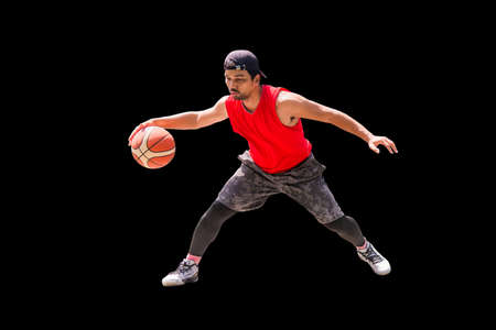 pose of basketball player dribbling basketball on colored background with clipping path