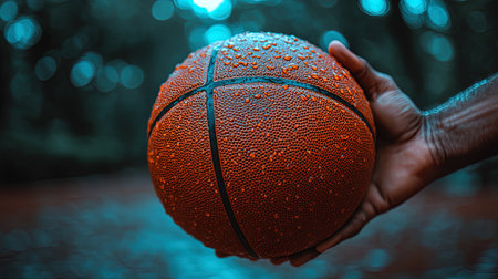Athlete is holding a wet basketball after a rain shower
