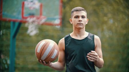 Portrait of a young basketball player with ball in the park.