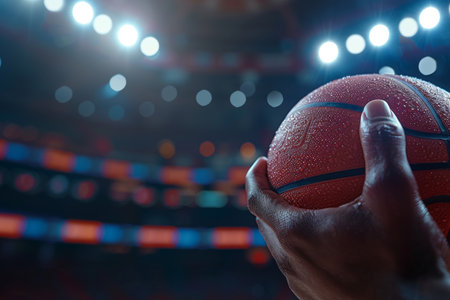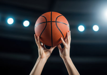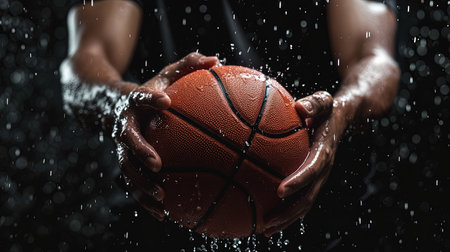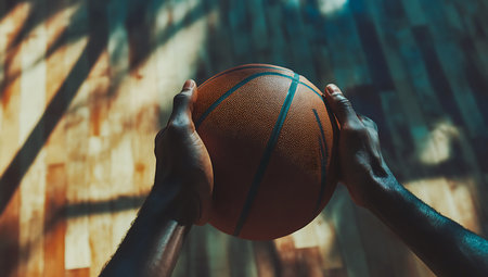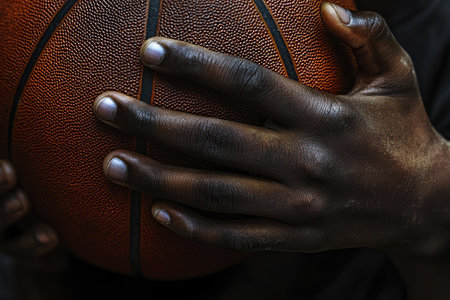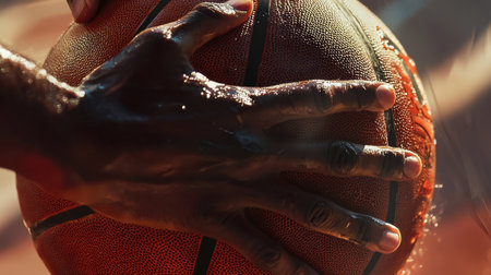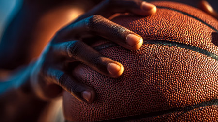 A dynamic close-up captures hands gripping a basketball, emphasizing its texture and dramatic lighting, perfect for sports-themed projects or promotional materials.