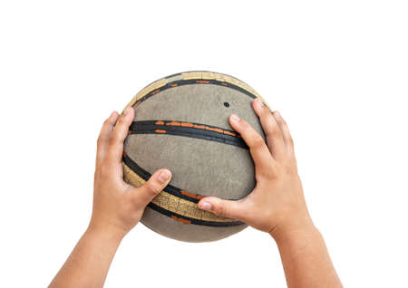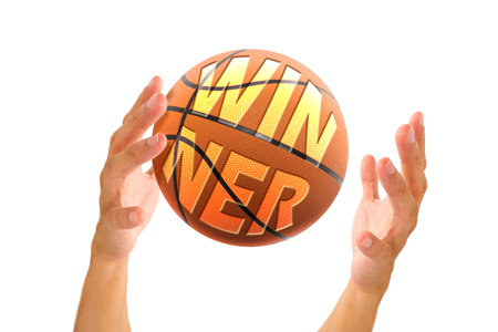 A basketball is held by two hands, ready for a shot, isolated on a clean white background with blurred lights.