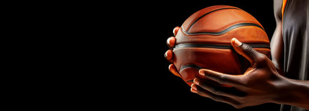 Extreme close-up of the hand of an African-American basketball player holding an orange and black basketball ball isolated on black background with copy space. Wide banner. Generative Ai.