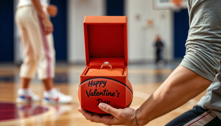 Valentine's Day Proposal. A person holds a basketball-themed ring box with Happy Valentine's Day text, proposing on a basketball court.