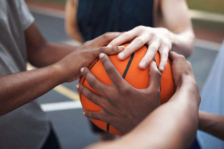 Teamwork, support and hands holding basketball start sports competition, game and league match. Black community of athlete playing, training and competing on outdoor court for good sportsmanship
