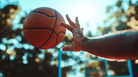 Capturing a moment of dynamic action, this image showcases a player's hand reaching out for a basketball in soft sunlight, emphasizing energy and athleticism in sports.