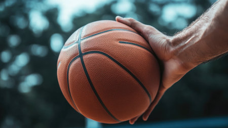 A close-up image of a hand gripping a basketball, showcasing its textured surface against a blurred outdoor background, perfect for sports-related themes and concepts.