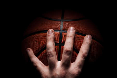A close-up image of a hand gripping a worn basketball, with visible court lines in the background. High contrast lighting highlights the texture of the ball and the hand.