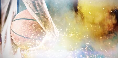 Composition of midsection of african american male basketball player holding ball with copy space. sport and competition concept digitally generated image.