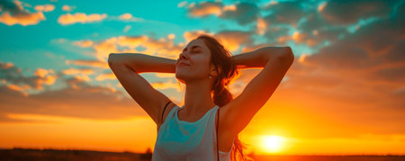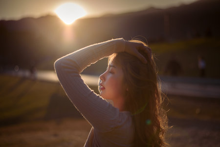A young woman basks in the warmth of setting sun eyes closed savoring tranquility of nature.