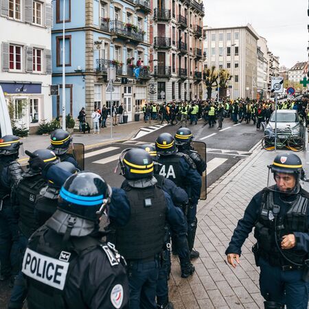 STRASBOURG, FRANCE - DEC 8, 2018: Police officers securing the zone in front of the Yellow vests movement protesters on Quai des Bateliers street
