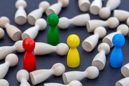 Wooden figures of people of different colors on a black background.