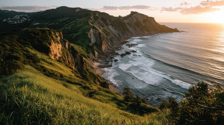 A beautiful coastal view captures the stunning cliffs and gentle ocean waves at sunset. Lush greenery frames the scene, creating a tranquil and picturesque landscape.