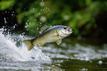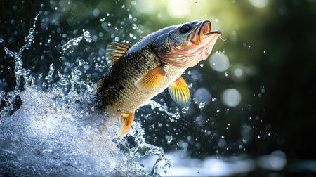 Bass fish jumping out of river water made. Generative AI illustrator