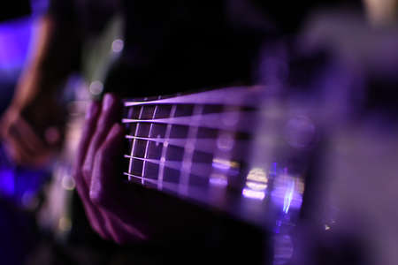 The musician plays the electric bass guitar on stage. Guitar neck close-up on a concert of rock music in the hands of a musician. Fingers on fretboard. Guitar neck close-up on a concert of rock music in the hands of a musician. Fingers on fretboard